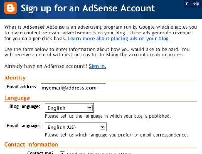 The next page displays an AdSense sign-up page. If you're new to AdSense, go ahead and fill it out to create an account. If you already have an AdSense account, click the sign in link instead so you don't accidentally make an extra account.